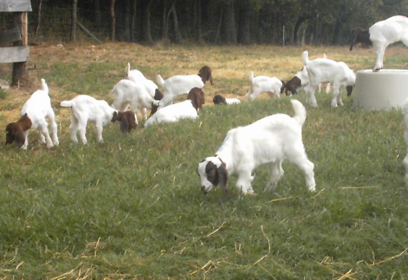 Trying out new things lasts about two weeks but as with all kids, they get bored and stick to the doe like glue. With a lot of courage, some of the babies refuse to stay in the barnyard as the does go out to graze and they follow them but not far. Each day, steps go further and further until one day, they venture out into the pasture.