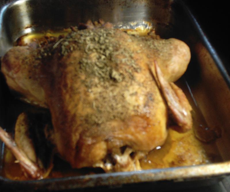 Stuffing: It's easy to make this, first toast 4 slices of bread, cube it up and set aside. In a small frying pan put 1 Tablespoon of REAL BUTTER in and melt. To that add 1 chopped up med onion and a half a stalk of chopped celery. Gently fry it till it is caramelized and browned. Now for the spices: A pinch of powdered sage, salt and pepper, and about 1/2 teaspoon of Old Bay Spice. The original one but sometimes I use the Garlic and Herb old spice. The results will astound you. All of the spiced steam up through the bird. It doesn't taste like it smells either.