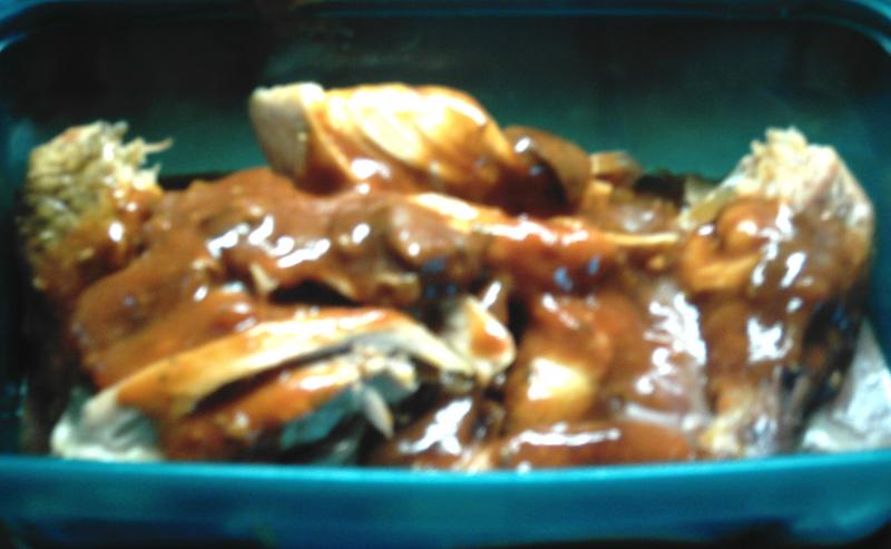 Part 2 The left oversBar-B-Que ChickenLeft over chicken is picked off the bones and put in a freezer proof container. Over that is poured Bar-B-Que sauce, out of a bottle or your own.I use Kraft Original and start to Doctor it with cut up baby onions, brown sugar and lemon juice to water it up a bit. The the lid goes on and into the freezer. When the time comes, it's thawed out, more sauce and light the grille. Quick and easy.Now that's two meals out of one chicken. The gravy, stock and picked bones are simmering. After 30 minutes of simmering, pick out the bones and call the dog. To the pot add chopped onions, chopped carrots, chopped celery, cubed raw potato and left over peas and onions with the sauce. Some of the chicken breast is in there too. To that pot I added sea salt and will let it simmer until the potatoes are done then thicken up the broth with flour or corn starch, about 1/2 a teaspoon.To add flour or cornstarch, take 1/4 cup of juice out of the pot and put in a cup, stir in the flour or corn starch and make a loose paste and return all of it to the pot and stir up. It thickens quickly.Tomorrow is Chicken Pot Pie for Dinner so stay tuned for tomorrow.Three meals came out of One chicken. Good Eating, healthy and Home Cooked. Bon-appetite.
